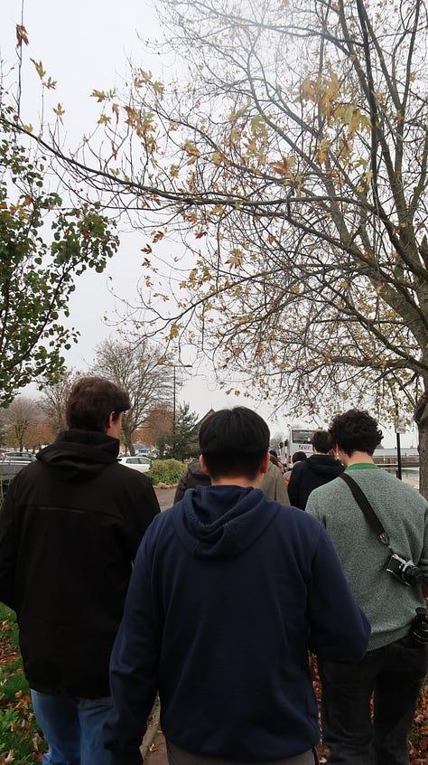 My friend Hanna and I woke up at 5:45 am and trudged to the metro. We hopped off the subway and met up with our other friends at the bus stop. Everyone trickled in at different times. Madeline and Annabelle arrived shortly after we did, then Louis and Ed. Sofia, worryingly, texted us to ask if the bus would leave without her, and Curtis nonchalantly walked up to us right before we were to board. We called my friend liv ₊˚⊹ ᰔ , but it turned out that she had turned off her alarms in her sleep and would not make it on time. I was shocked. This was incredibly unlike her! In fact, she texted me the night before that she had hustled to get her work done before this weekend, and what am I going to pack? As for our friend Gellert, we didn’t hear from him until we boarded the bus. If I had to bet which friend wasn’t making it, it would be him, so I wasn’t that surprised.