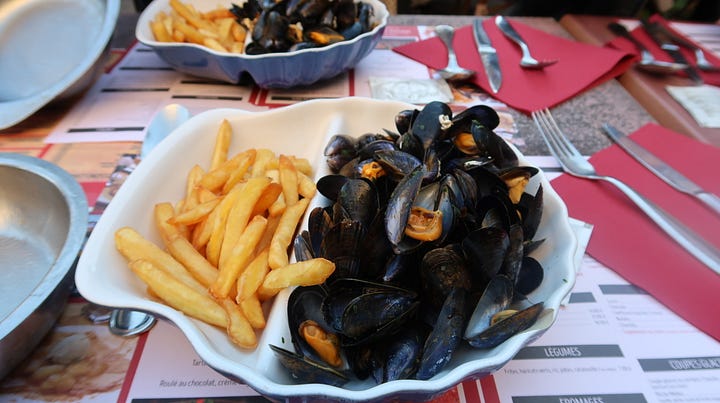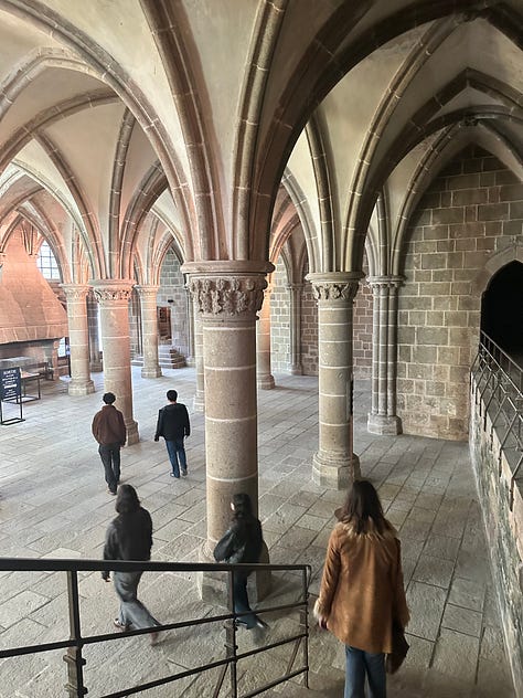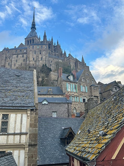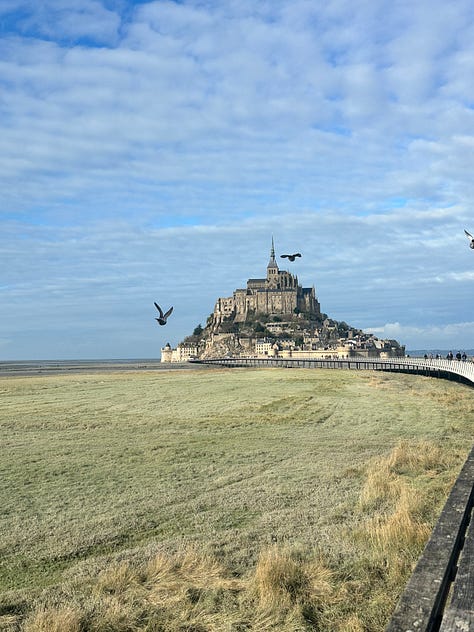 Now for the star of the trip! After departing the peaceful Saint-Malo, our adventure picks up speed as we arrive at Mont Saint-Michel. This place has been on my bucket list since before moving to France. It’s a tidal island a kilometre off the mainland and was only accessible during low tide in the Middle Ages. Our tour guide told us we had four hours to explore here, so needless to say, we set off on foot quite quickly. The ten of us walked up the windy, rocky, and narrow streets, admiring the signs and saying to each other how much it reminded us of a medieval city that Universal Studios tries to replicate (spoiler, this one’s the original). Turns out, this island inspired the Kingdom of Corona in Disney’s Tangled, which is why it looked so familiar. My friends and I had mussels and fries before setting off to explore the abbey at the top of the mountain. If there was a movie or short film sequence, hanging out with my friends as we climbed the steps of the abbey and through the winding corridors of the church up top would make a great montage.