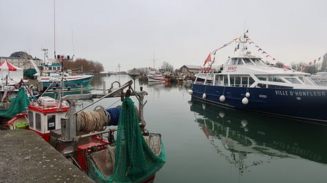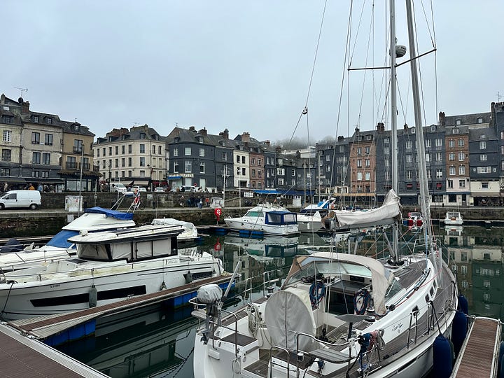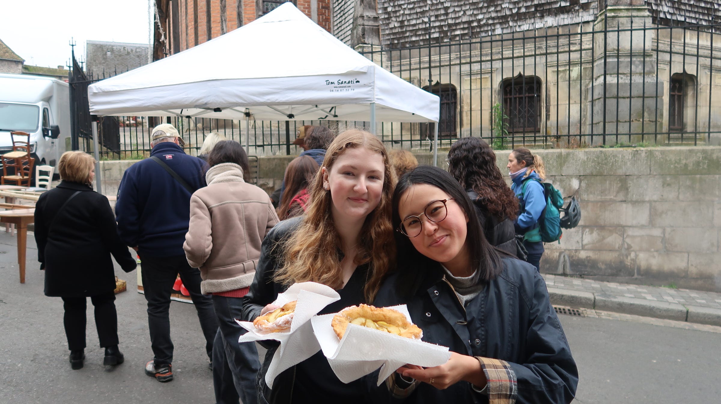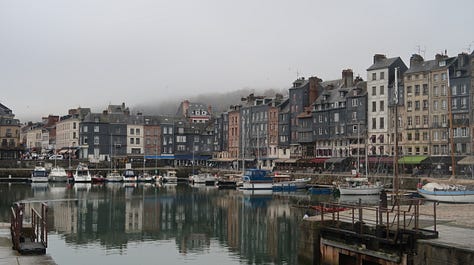 Honfleur sits on the estuary that links the Seine to the English Channel. It has an old harbor and plenty of 16th- and 18th-century townhouses. When we arrived, we were greeted by fog descending from the distant mountains. Since it was Saturday, we happily explored the local farmer’s market. Hanna, Annabelle, and I enjoyed a lovely 3-euro apple strudel for breakfast. After just one bite, we had sugar coating our chins and sprinkling down the fronts of our jackets. Talk about a sweet start!